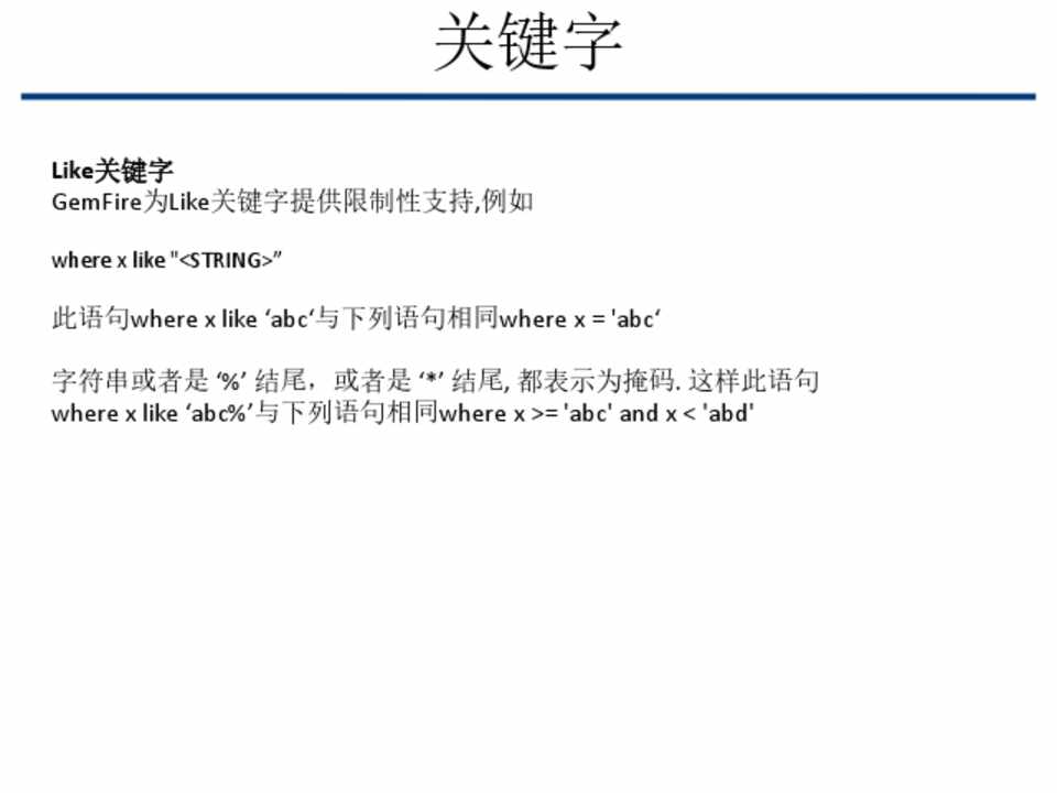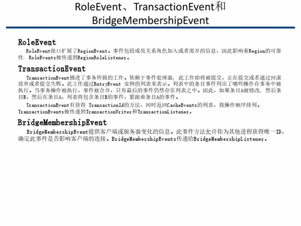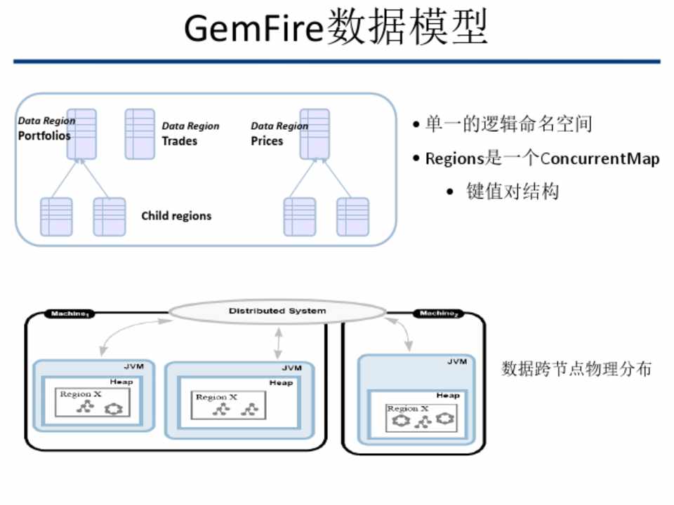 运行在Gemfire上的VMs组成了分布式系统。每一个MV都作为一个Gemfire对等体存在。启动Gemfire对等体,在 每个VM对等体上你创建了一个缓存。每一个缓存管理到其他VM对等体的连接。通过UDP多播或者TCP位置服务, 互相发现。 Region是一个分布式系统之上的抽象概念。一个Region允许你在系统的多个VM中存储数据,不用考虑数据存在那 个对等体上。Region给你一个map接口能透明地从合适的VM上获取数据。这个Region类扩展了java.util.Map接 口,但是它也支持查询和事务。 一个Replicated Region保存着所有分区的数据拷贝 Partitioned Regions只保存一部分分区的数据拷贝 分布式成员,如p2p, Gemfire分布式系统是一个网格结构,所有的Peer直接互相连接。Gemfire也支持客户端,客户端有他们自己的本 地数据缓存,他们能够更新他们的本地缓存,通过注册服务器来更新改变的数据。 Gemfire支持’非共享’持久化,每一个peer持久化数据到本地磁盘,Gemfire持久化也允许你在磁盘上维护一份 配置的数据拷贝。 在 Gemfire 分布式系统中,加入到集群中的某个成员,有多种角色。