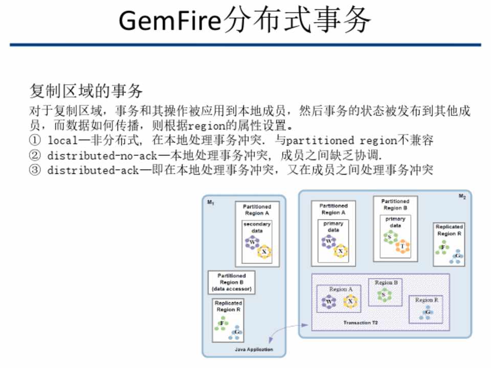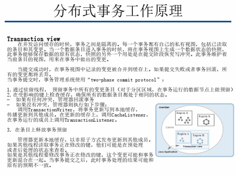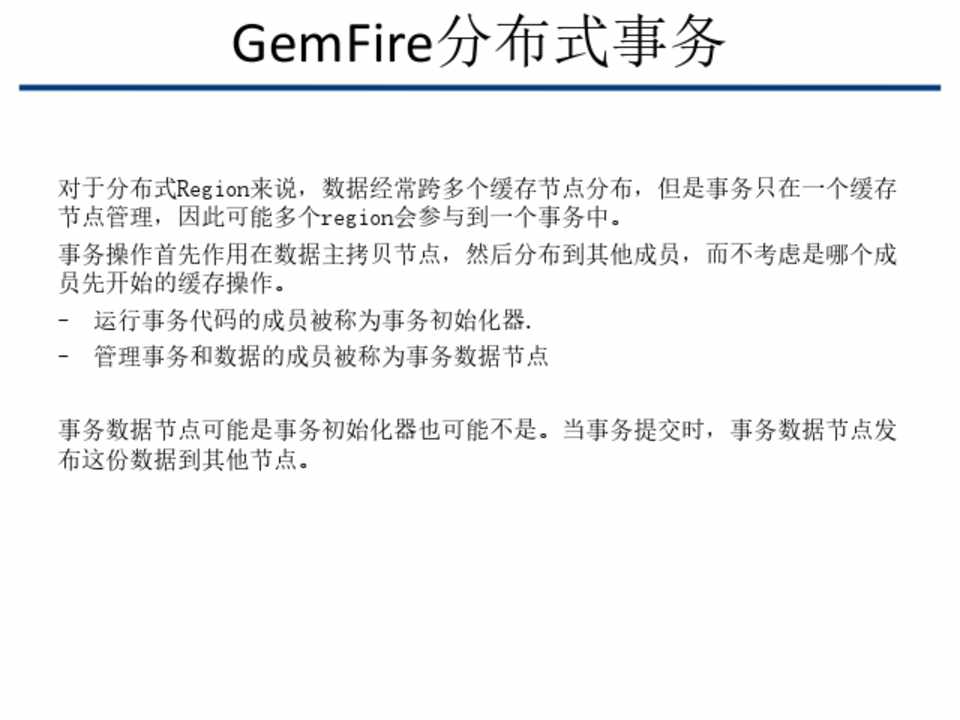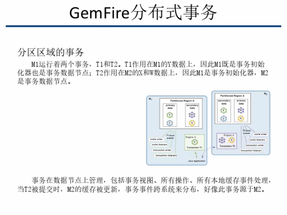 在 Gemfire 分布式系统中,在多个网络节点上访问或更新数据,跨节点来协调事务提交或回滚。