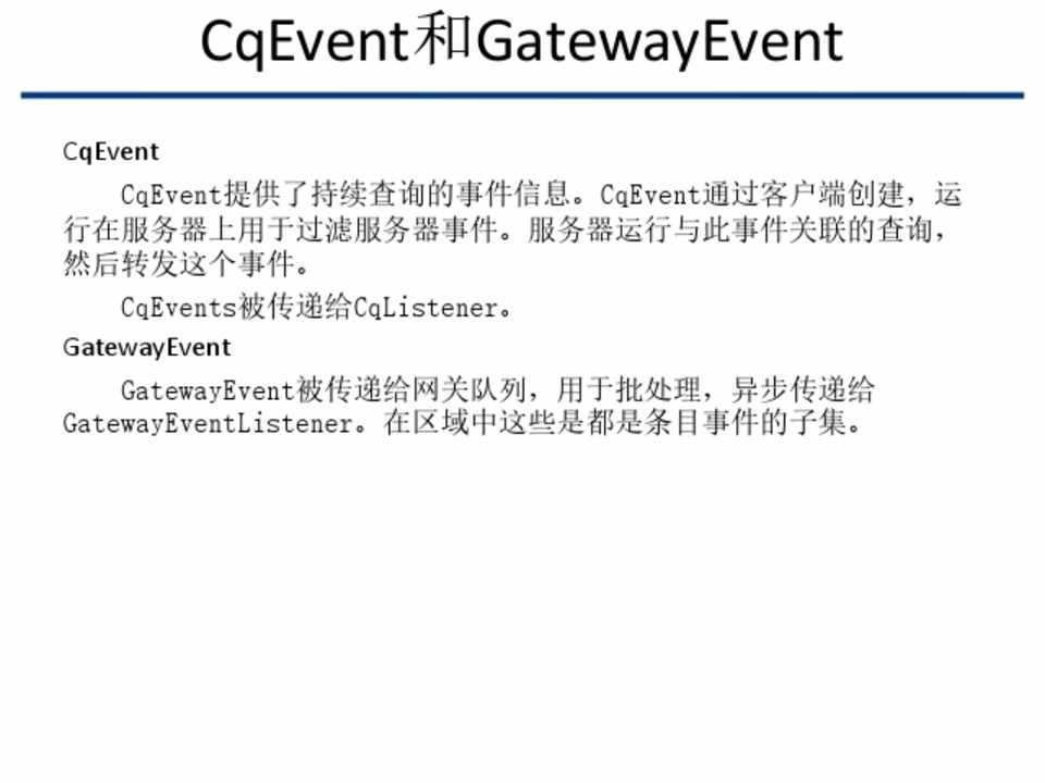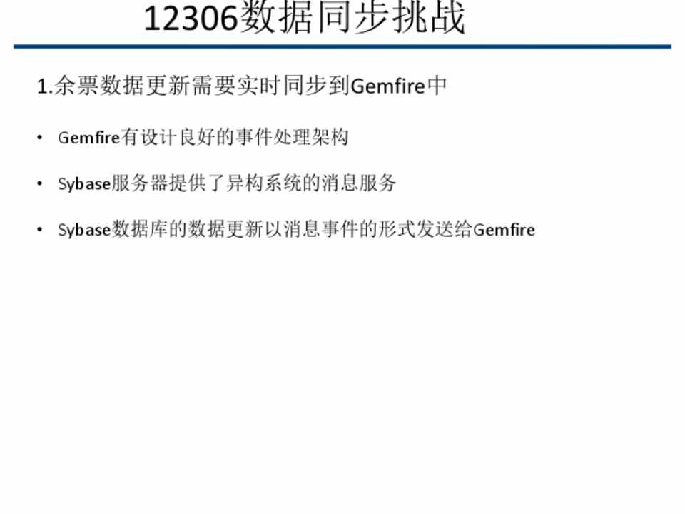 • Gemfire有设计良好的事件处理架构 • Sybase服务器提供了异构系统的消息服务 • Sybase数据库的数据更新以消息事件的形式发送给Gemfire