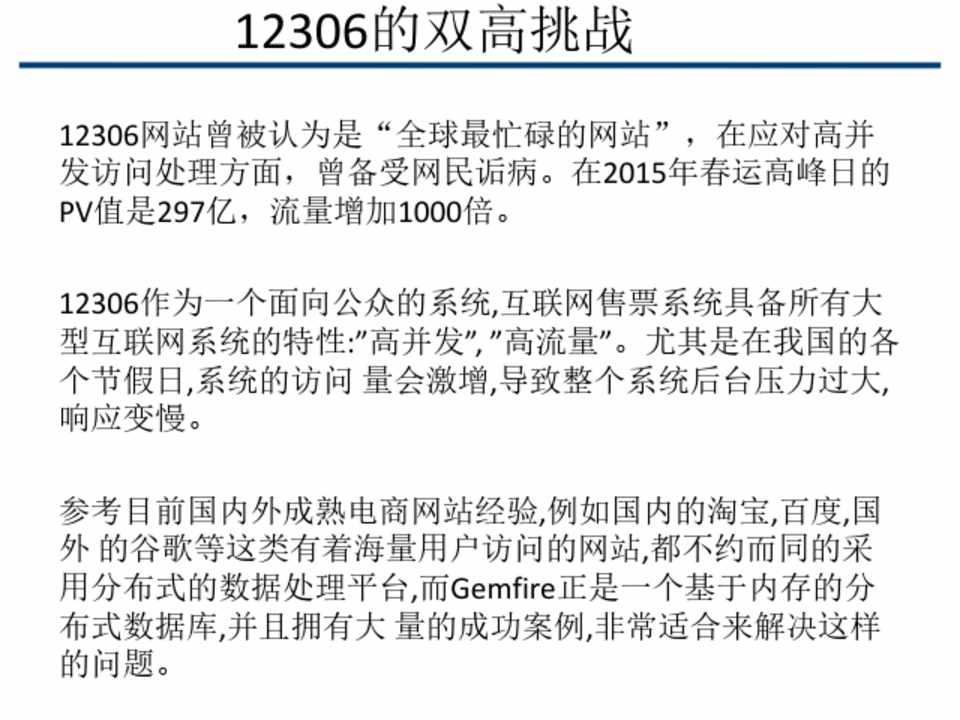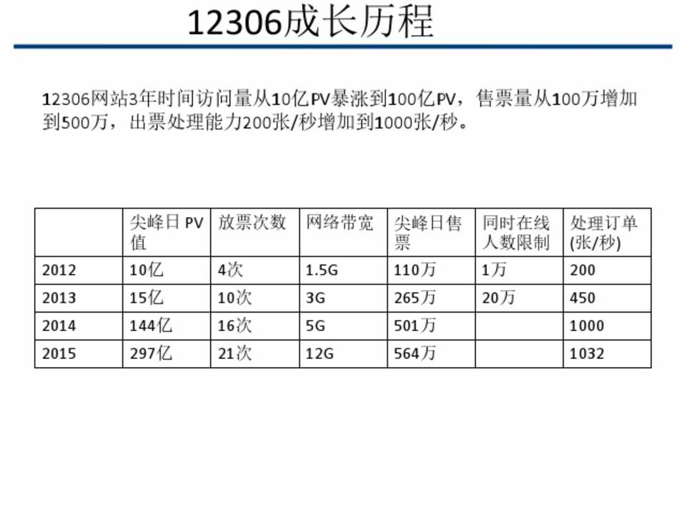 12306网站曾被认为是“全球最忙碌的网站”,在应对高并 发访问处理方面,曾备受网民诟病。在2015年春运高峰日的 PV值是297亿,流量增加1000倍。