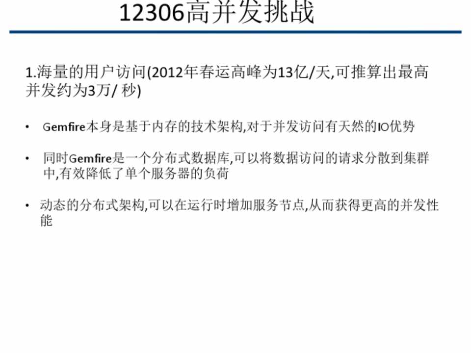 1.海量的用户访问(2012年春运高峰为13亿/天,可推算出最高 并发约为3万/ 秒)