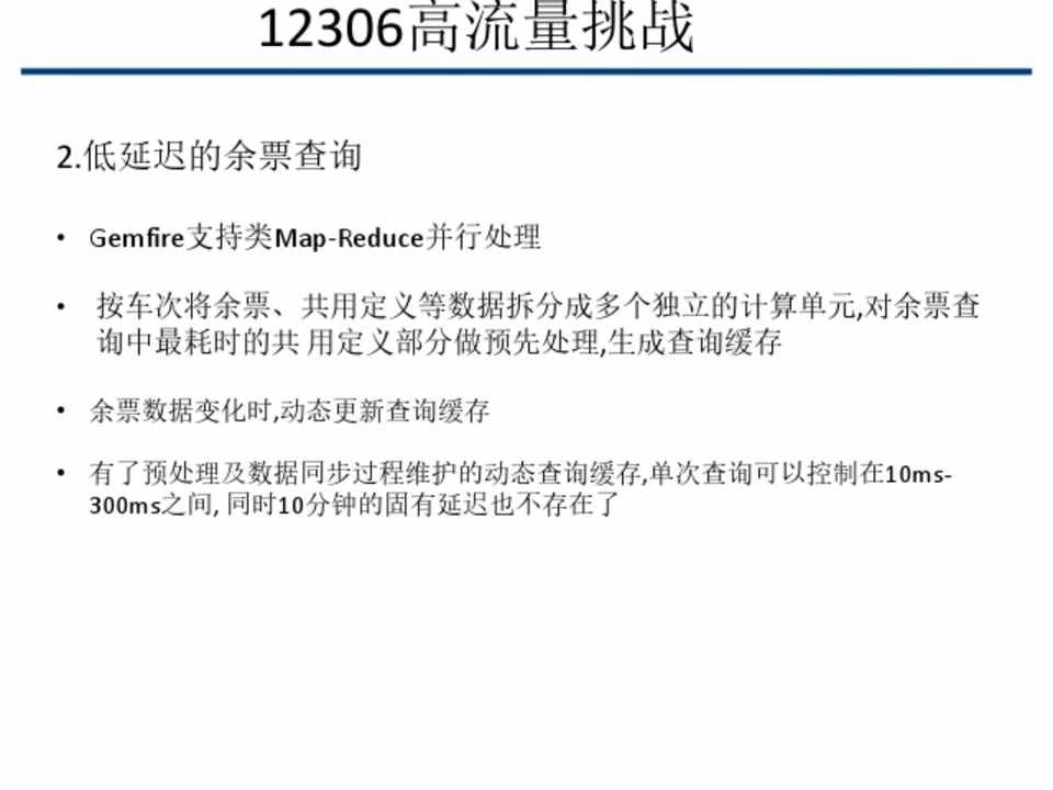 • Gemfire支持类Map-Reduce并行处理 • 按车次将余票、共用定义等数据拆分成多个独立的计算单元,对余票查