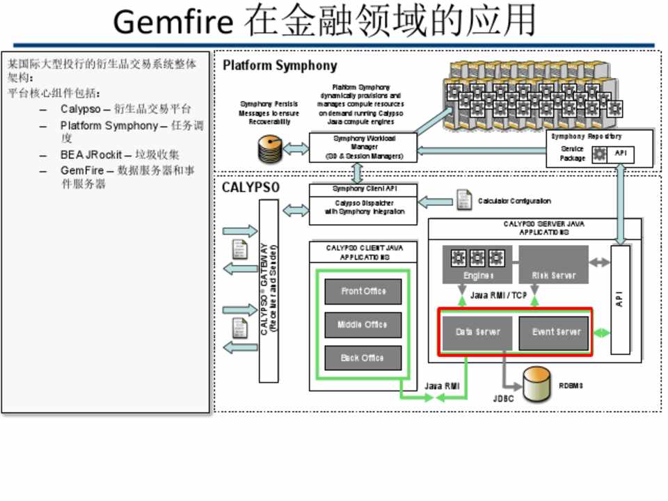金融危机后,金融监管法规Dodd-Frank、Basel3等陆续出台,各大投资银行为了减少系统风险和 增加透明度,加强了金融衍生品交易平台的投资规模,Gemfire击败Oracle等老牌厂商,跻身为华 尔街第一大分布式数据处理平台软件。