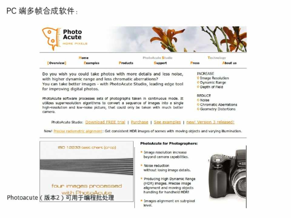 PC 端多帧合成特点: 1. 象素能够达到 78M 以上(达到印刷画质的要求) 2. 能够实现降噪(尤适合高 ISO 夜景画面)及景深扩展 3. 相对手机端,适合进行几分钟至半小时不等的耗时处理