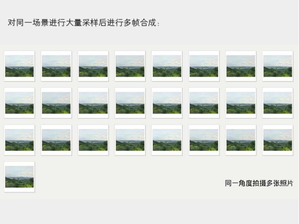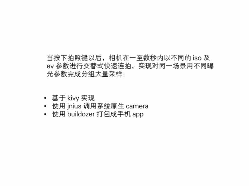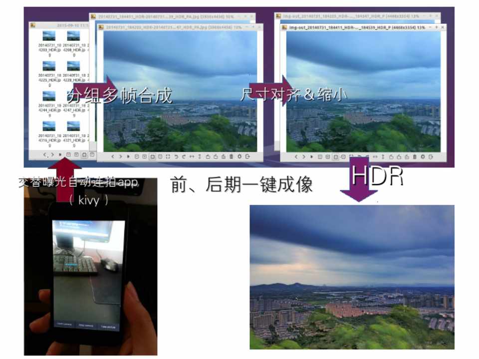当按下拍照键以后,相机在一至数秒内以不同的 iso 及 ev 参数进行交替式快速连拍,实现对同一场景用不同曝 光参数完成分组大量采样: