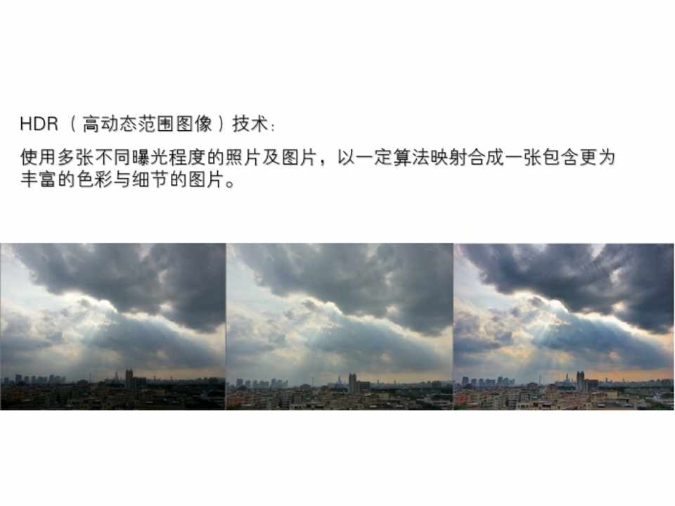 使用多张不同曝光程度的照片及图片,以一定算法映射合成一张包含更为 丰富的色彩与细节的图片。