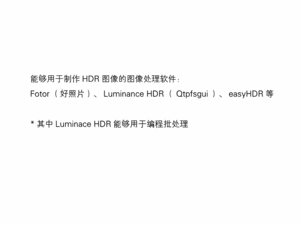 能够用于制作 HDR 图像的图像处理软件: Fotor (好照片)、 Luminance HDR ( Qtpfsgui )、 easyHDR 等