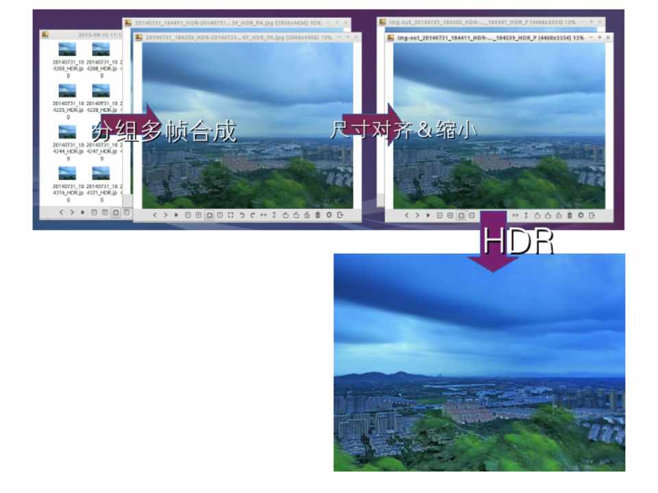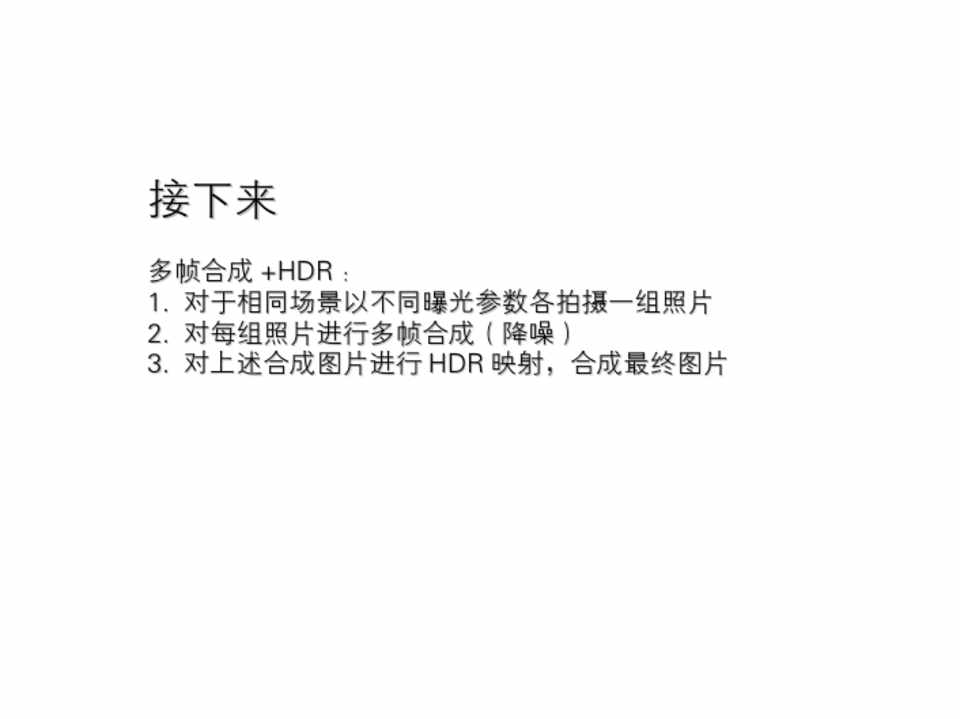 多帧合成 +HDR : 1. 对于相同场景以不同曝光参数各拍摄一组照片 2. 对每组照片进行多帧合成(降噪) 3. 对上述合成图片进行 HDR 映射,合成最终图片