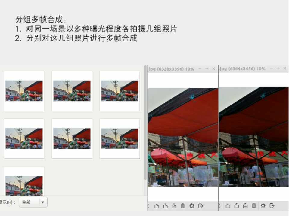 分组多帧合成: 1. 对同一场景以多种曝光程度各拍摄几组照片