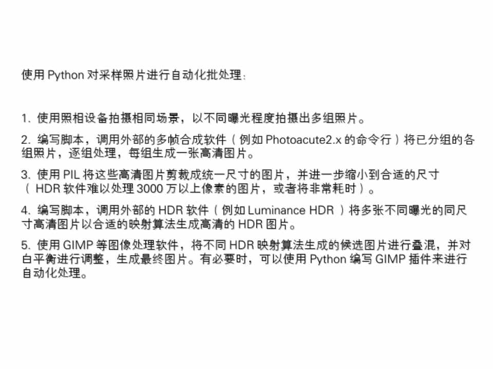 5. 使用 GIMP 等图像处理软件,将不同 HDR 映射算法生成的候选图片进行叠混,并对 白平衡进行调整,生成最终图片。有必要时,可以使用 Python 编写 GIMP 插件来进行 自动化处理。