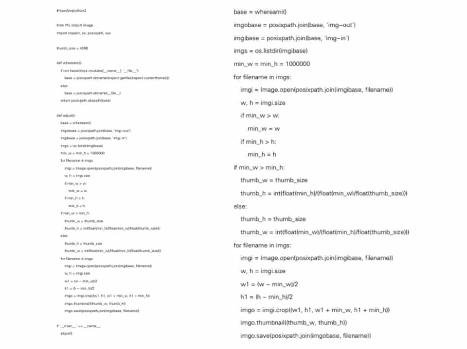 def adjust(): base = whereami() imgobase = posixpath.join(base, 'img-out') imgibase = posixpath.join(base, 'img-in') imgs = os.listdir(imgibase) min_w = min_h = 1000000 for filename in imgs: imgi = Image.open(posixpath.join(imgibase, filename)) w, h = imgi.size if min_w > w: min_w = w if min_h > h: min_h = h if min_w > min_h: thumb_w = thumb_size thumb_h = int(float(min_h)/(float(min_w)/float(thumb_size))) else: thumb_h = thumb_size thumb_w = int(float(min_w)/(float(min_h)/float(thumb_size))) for filename in imgs: imgi = Image.open(posixpath.join(imgibase, filename)) w, h = imgi.size w1 = (w - min_w)/2 h1 = (h - min_h)/2 imgo = imgi.crop((w1, h1, w1 + min_w, h1 + min_h)) imgo.thumbnail((thumb_w, thumb_h)) imgo.save(posixpath.join(imgobase, filename))