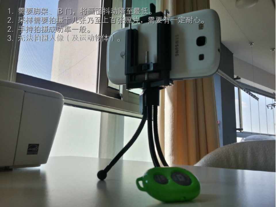1. 需要脚架、 B 门,将画面抖动降至最低。 2. 采样需要拍摄十几张乃至上百张照片,需要有一定耐心。