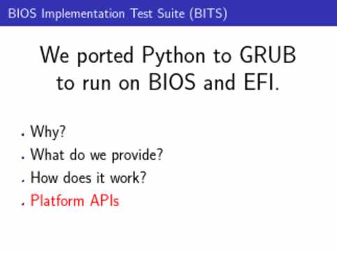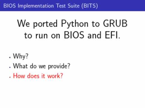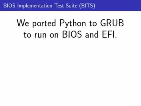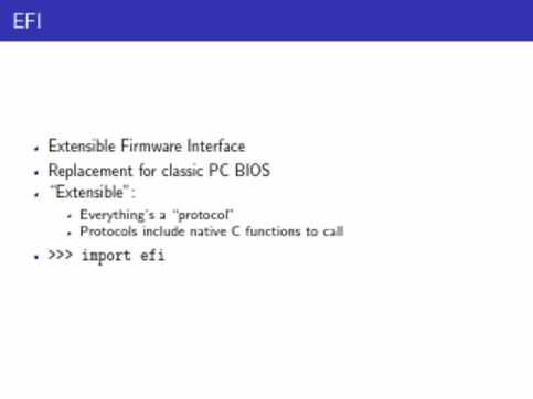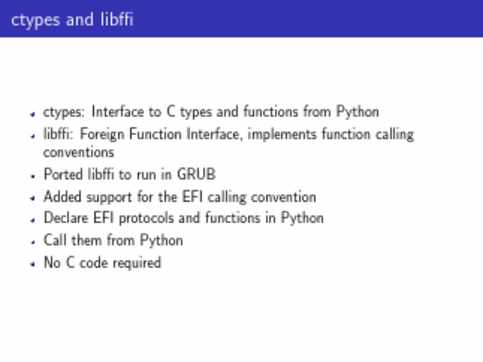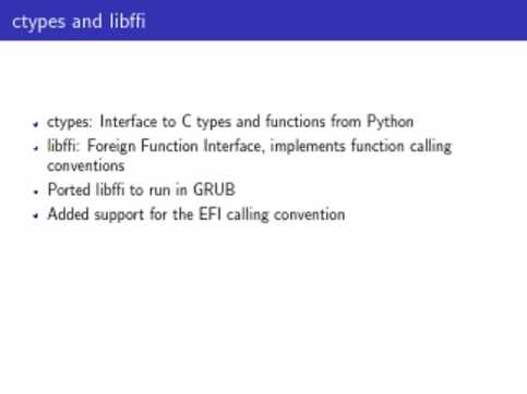 ctypes: Interface to C types and functions from Python libffi: Foreign Function Interface, implements function calling conventions Ported libffi to run in GRUB Added support for the EFI calling convention Declare EFI protocols and functions in Python Call them from Python No C code required