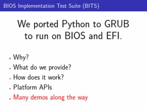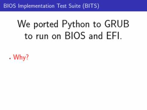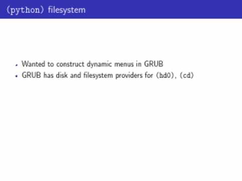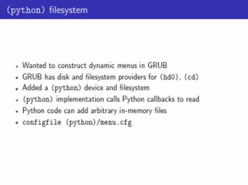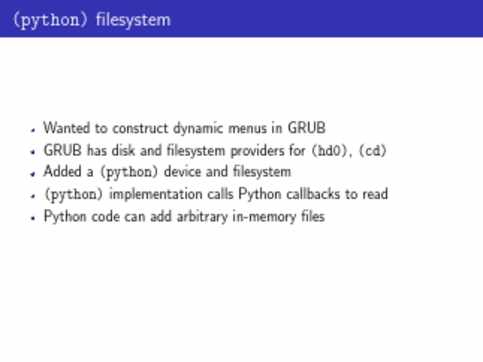 Wanted to construct dynamic menus in GRUB GRUB has disk and filesystem providers for (hd0), (cd) Added a (python) device and filesystem (python) implementation calls Python callbacks to read Python code can add arbitrary in-memory files configfile (python)/menu.cfg