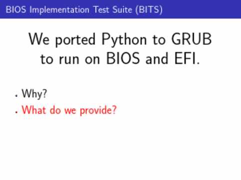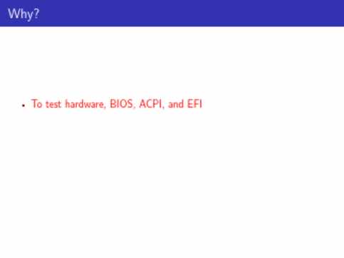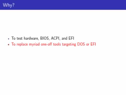 To test hardware, BIOS, ACPI, and EFI To replace myriad one-off tools targeting DOS or EFI