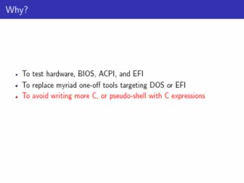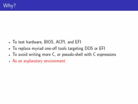 To test hardware, BIOS, ACPI, and EFI To replace myriad one-off tools targeting DOS or EFI To avoid writing more C, or pseudo-shell with C expressions As an exploratory environment