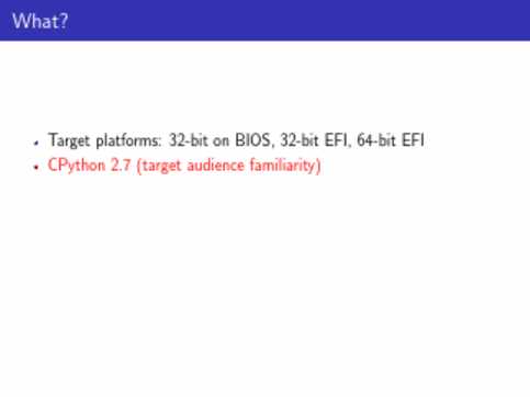 Target platforms: 32-bit on BIOS, 32-bit EFI, 64-bit EFI CPython 2.7 (target audience familiarity)