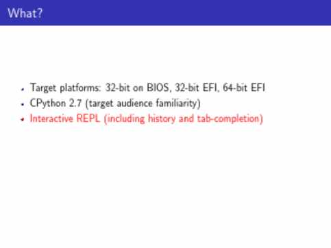Target platforms: 32-bit on BIOS, 32-bit EFI, 64-bit EFI CPython 2.7 (target audience familiarity) Interactive REPL (including history and tab-completion)