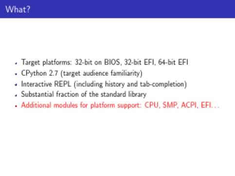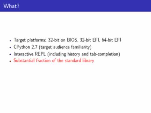 Target platforms: 32-bit on BIOS, 32-bit EFI, 64-bit EFI CPython 2.7 (target audience familiarity) Interactive REPL (including history and tab-completion) Substantial fraction of the standard library