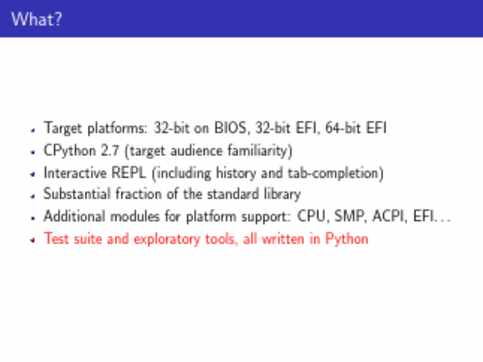 Target platforms: 32-bit on BIOS, 32-bit EFI, 64-bit EFI CPython 2.7 (target audience familiarity) Interactive REPL (including history and tab-completion) Substantial fraction of the standard library Additional modules for platform support: CPU, SMP, ACPI, EFI. . . Test suite and exploratory tools, all written in Python