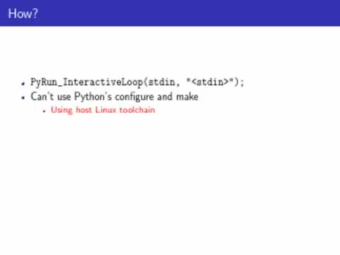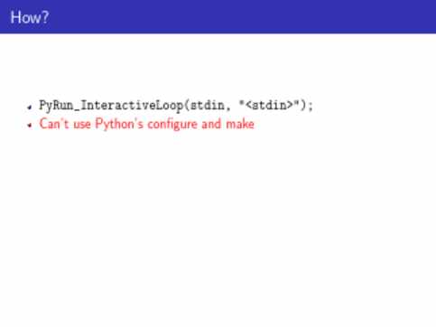 PyRun_InteractiveLoop(stdin, "<stdin>"); Can’t use Python’s configure and make