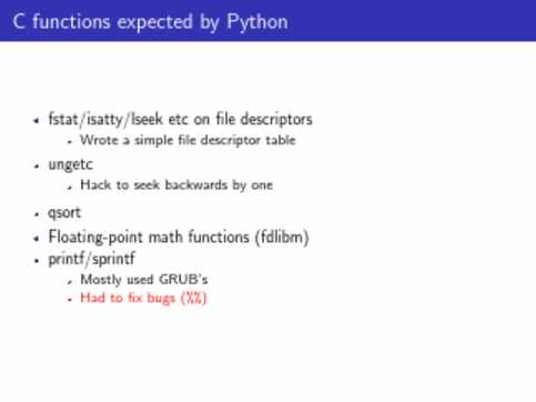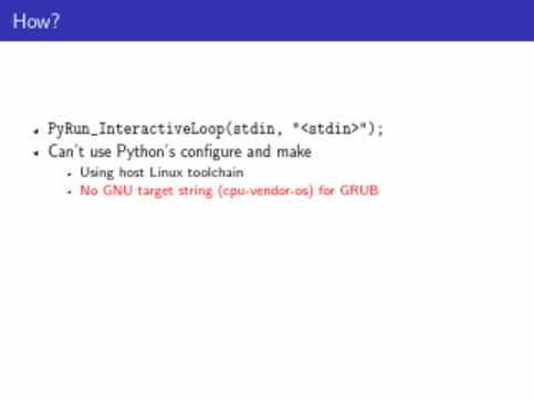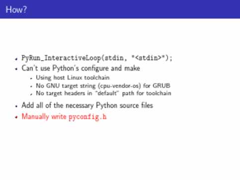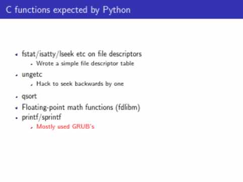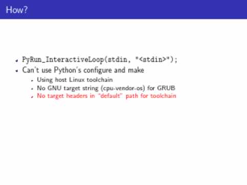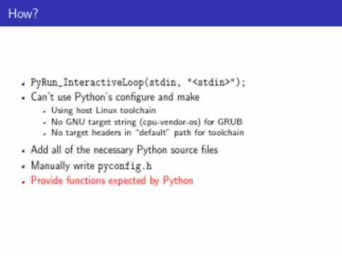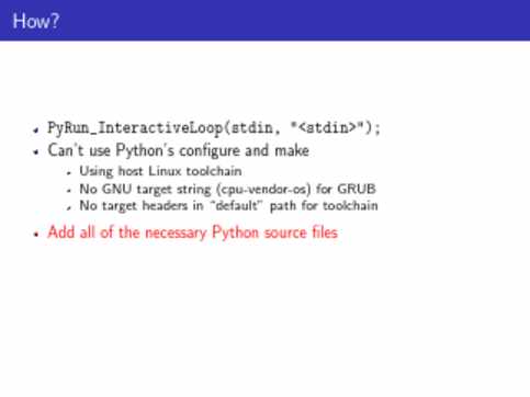 Using host Linux toolchain No GNU target string (cpu-vendor-os) for GRUB No target headers in “default” path for toolchain Add all of the necessary Python source files Manually write pyconfig.h Provide functions expected by Python