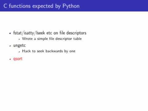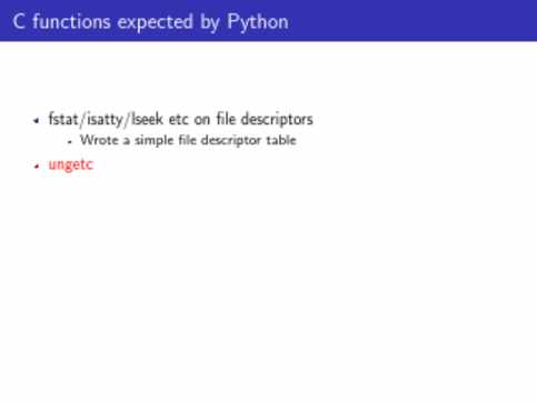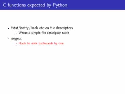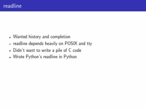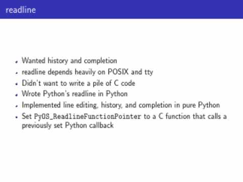 Wanted history and completion readline depends heavily on POSIX and tty Didn’t want to write a pile of C code Wrote Python’s readline in Python Implemented line editing, history, and completion in pure Python Set PyOS_ReadlineFunctionPointer to a C function that calls a previously set Python callback