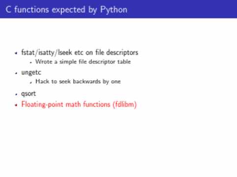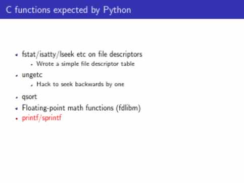 Slow boot time Extra painful in CPU simulation environments Python parser reads characters and uses ungetc Minimal disk caching Compile Python on host, use it to byte-compile into .pyc files No mtime support, so zero the mtime
