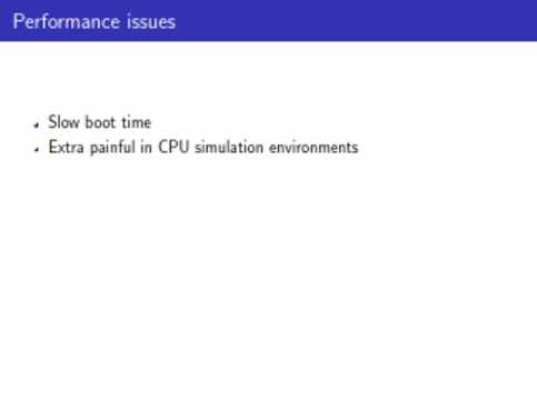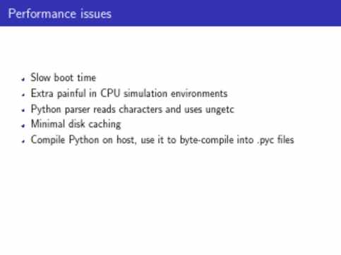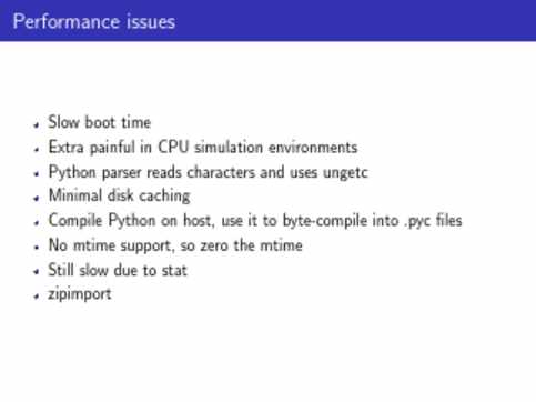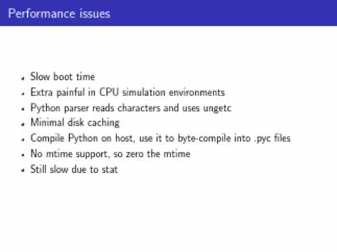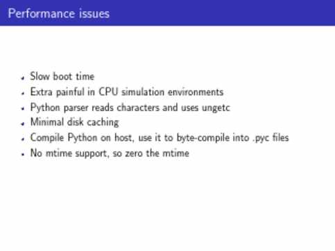 Slow boot time Extra painful in CPU simulation environments Python parser reads characters and uses ungetc Minimal disk caching Compile Python on host, use it to byte-compile into .pyc files No mtime support, so zero the mtime Still slow due to stat