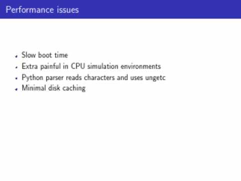 Slow boot time Extra painful in CPU simulation environments Python parser reads characters and uses ungetc Minimal disk caching