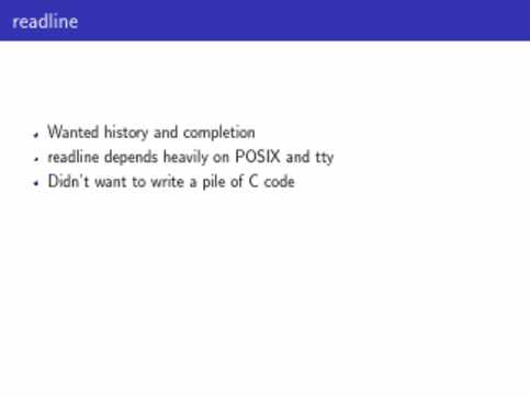 Wanted history and completion readline depends heavily on POSIX and tty Didn’t want to write a pile of C code Wrote Python’s readline in Python