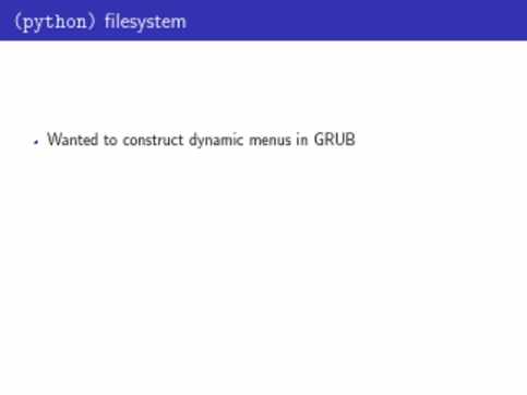 Wanted to construct dynamic menus in GRUB GRUB has disk and filesystem providers for (hd0), (cd) Added a (python) device and filesystem (python) implementation calls Python callbacks to read Python code can add arbitrary in-memory files