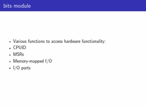 Various functions to access hardware functionality: CPUID MSRs Memory-mapped I/O I/O ports