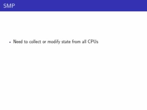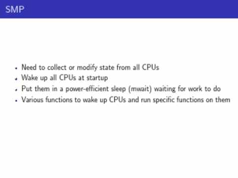 Need to collect or modify state from all CPUs Wake up all CPUs at startup Put them in a power-efficient sleep (mwait) waiting for work to do Various functions to wake up CPUs and run specific functions on them