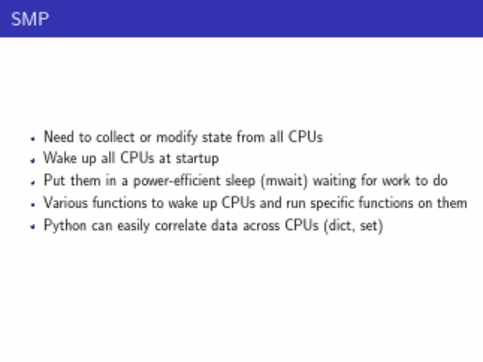 Need to collect or modify state from all CPUs Wake up all CPUs at startup Put them in a power-efficient sleep (mwait) waiting for work to do Various functions to wake up CPUs and run specific functions on them Python can easily correlate data across CPUs (dict, set)