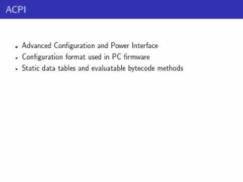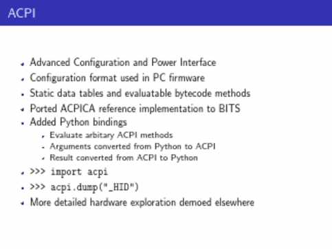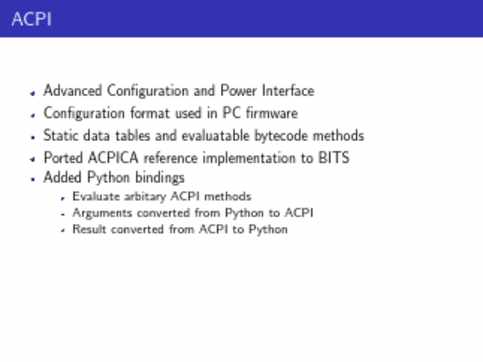 Advanced Configuration and Power Interface Configuration format used in PC firmware Static data tables and evaluatable bytecode methods Ported ACPICA reference implementation to BITS Added Python bindings