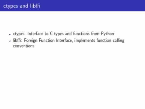 ctypes: Interface to C types and functions from Python libffi: Foreign Function Interface, implements function calling conventions