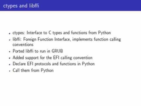 ctypes: Interface to C types and functions from Python libffi: Foreign Function Interface, implements function calling conventions Ported libffi to run in GRUB Added support for the EFI calling convention Declare EFI protocols and functions in Python Call them from Python