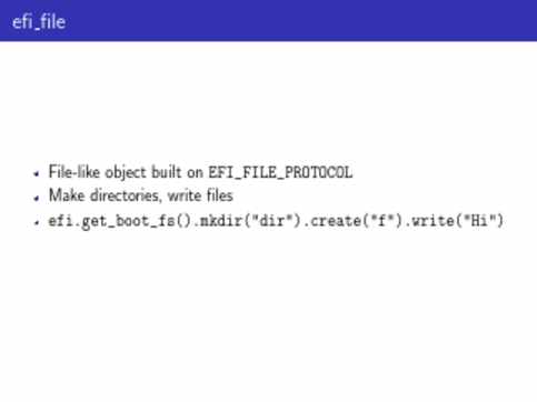 File-like object built on EFI_FILE_PROTOCOL Make directories, write files efi.get_boot_fs().mkdir("dir").create("f").write("Hi")