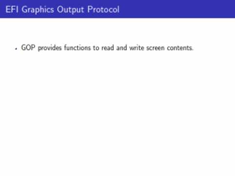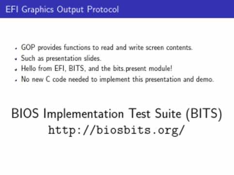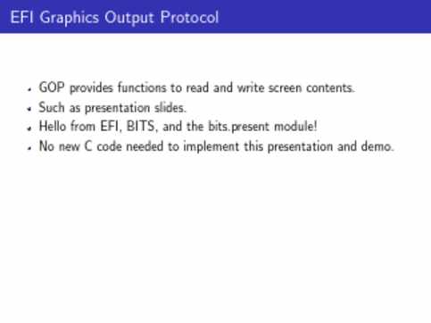 GOP provides functions to read and write screen contents. Such as presentation slides. Hello from EFI, BITS, and the bits.present module! No new C code needed to implement this presentation and demo.