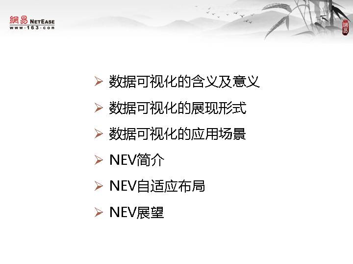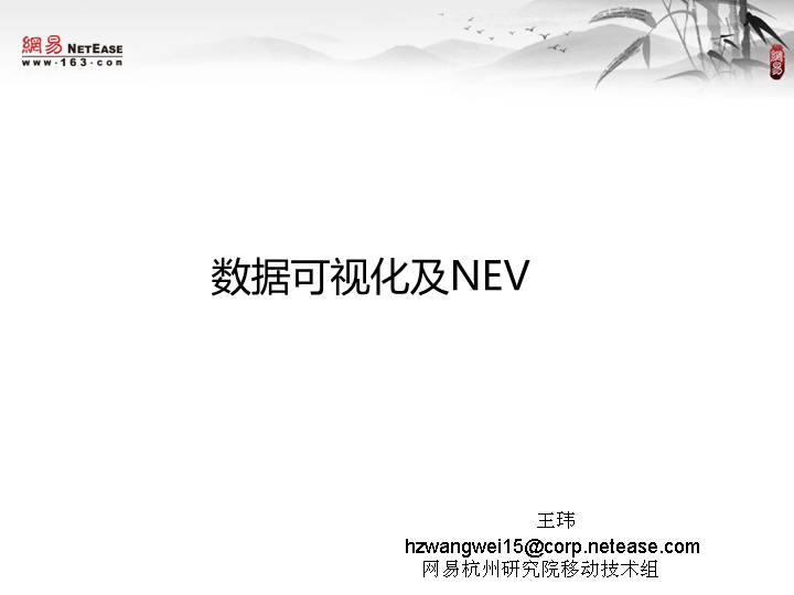 NEV是网易杭州研究院前端技术部完全自主研发的一款纯JavaScript编写的跨平台的数据可视化引擎,其主要目标是为用户提供简洁美观的数据可视化库,用户不需要关心细节问题