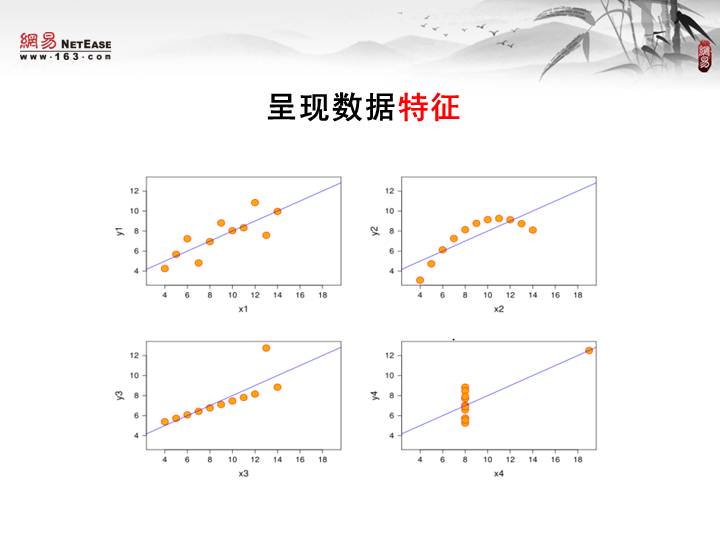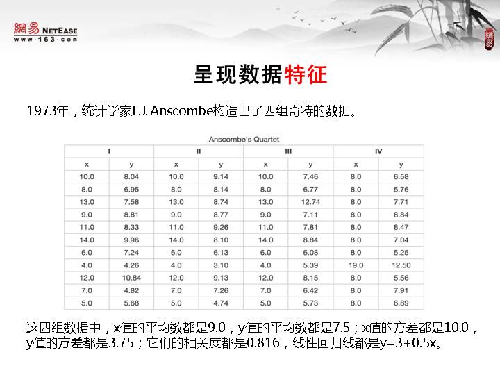 这四组数据中,x值的平均数都是9.0,y值的平均数都是7.5;x值的方差都是10.0,y值的方差都是3.75;它们的相关度都是0.816,线性回归线都是y=3+0.5x。