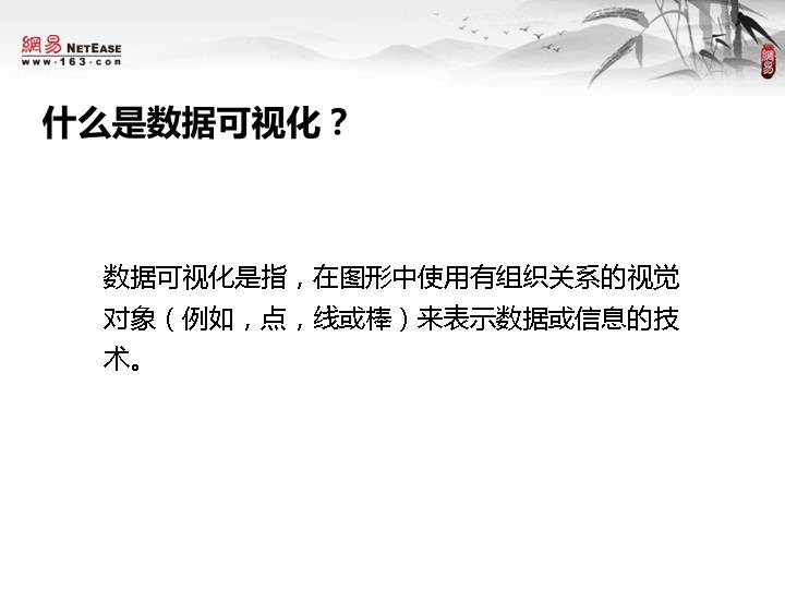 数据可视化是指,在图形中使用有组织关系的视觉对象(例如,点,线或棒)来表示数据或信息的技术。