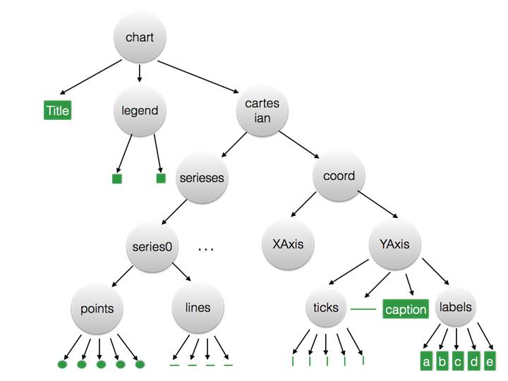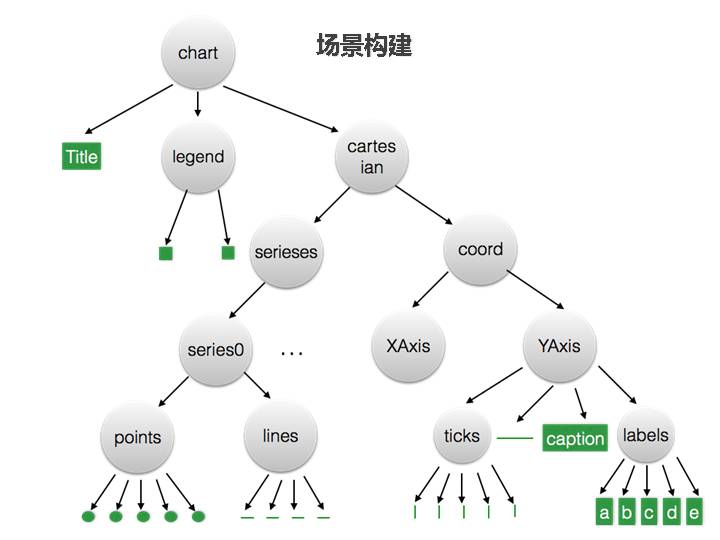 场景构建---此阶段主要是根据上一阶段计算得到的信息来构建一颗用于描述图表结构组成的场景树,场景树中的每一个节点是一个精灵,从功能上来看,精灵分为容器精灵和可视化精灵,容器精灵主要是用于组织场景的结构,一般为非叶子节点,而可视化精灵主要是用于承载可视化编码信息