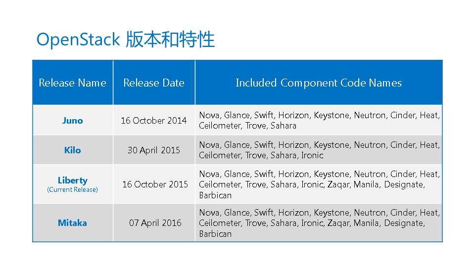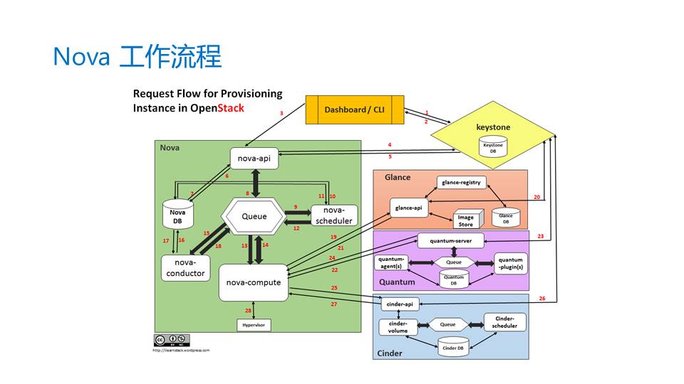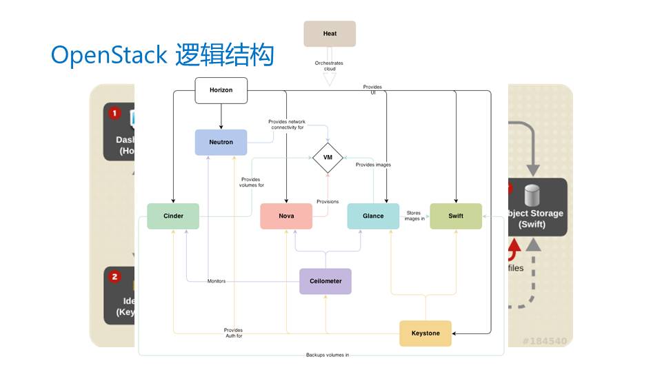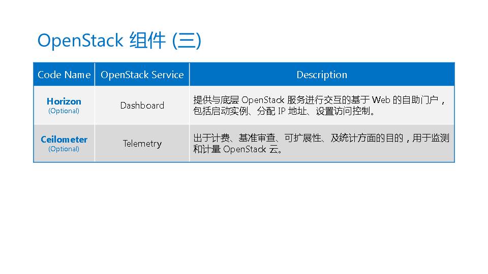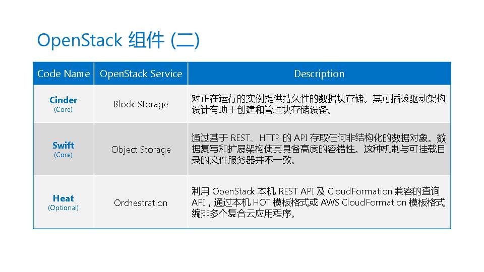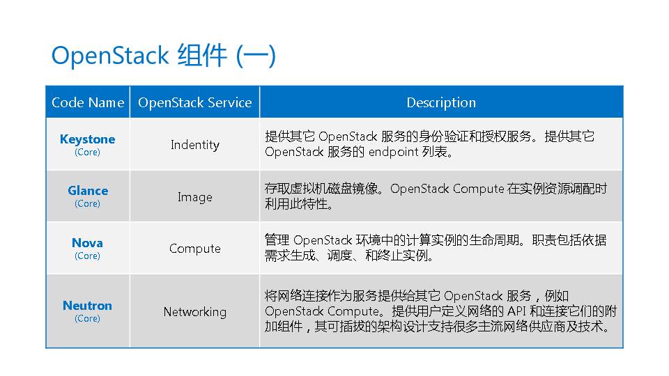 核心组件Keystone、Glance、Nova、Neutron、Cinder等。
