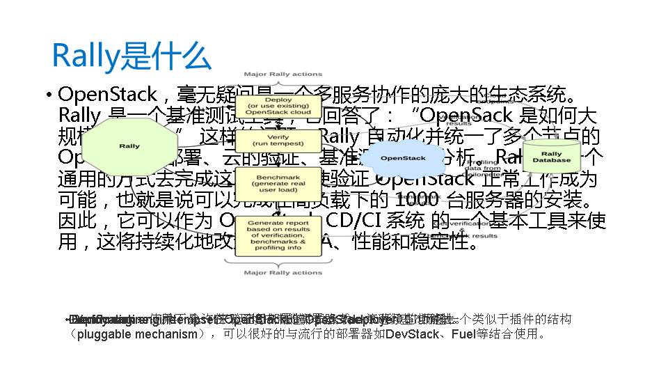 OpenStack,毫无疑问是一个多服务协作的庞大的生态系统。Rally 是一个基准测试工具,它回答了:“OpenSack 是如何大规模运作的?” 这样的问题。Rally 自动化并统一了多个节点的OpenStack 部署、云的验证、基准测试以及分析。Rally 以一个 通用的方式去完成这项工作,使验证 OpenStack 正常工作成为可能,也就是说可以完成在高负载下的 1000 台服务器的安装。因此,它可以作为 OpenStack CD/CI 系统 的一个基本工具来使用,这将持续化地改进它的 SLA、性能和稳定性。