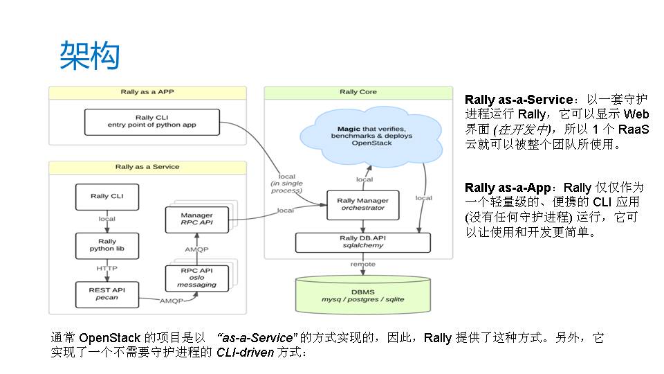 通常 OpenStack 的项目是以“as-a-Service”的方式实现的,因此,Rally 提供了这种方式。另外,它实现了一个不需要守护进程的CLI-driven方式: