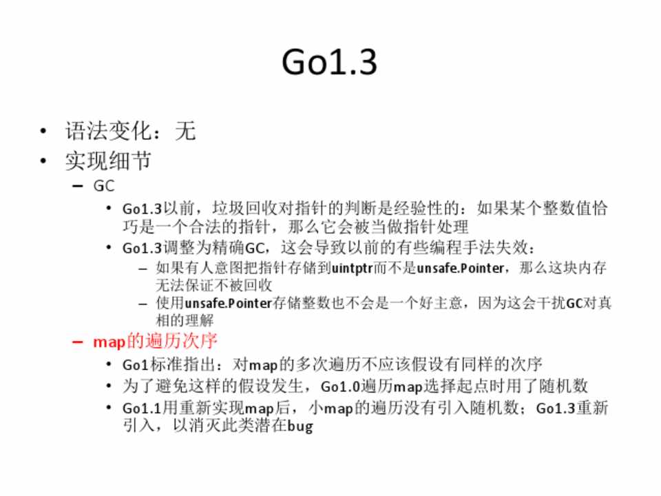 • Go1标准指出:对map的多次遍历不应该假设有同样的次序 • 为了避免这样的假设发生,Go1.0遍历map选择起点时用了随机数 • Go1.1用重新实现map后,小map的遍历没有引入随机数;Go1.3重新