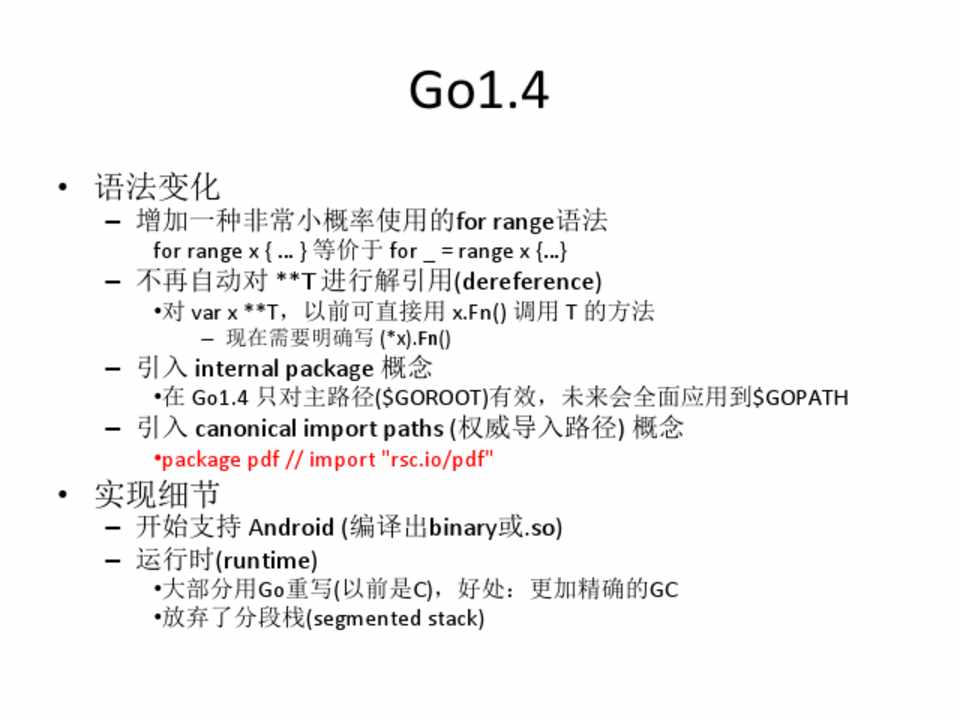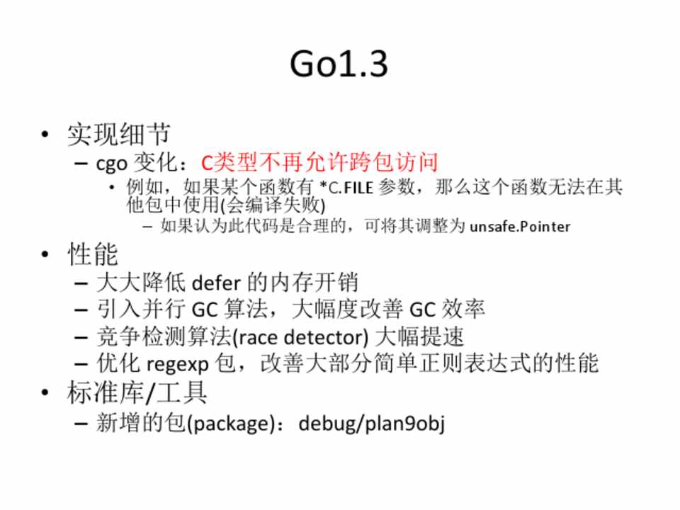 – 大大降低 defer 的内存开销 – 引入并行 GC 算法,大幅度改善 GC 效率 – 竞争检测算法(race detector) 大幅提速 – 优化 regexp 包,改善大部分简单正则表达式的性能