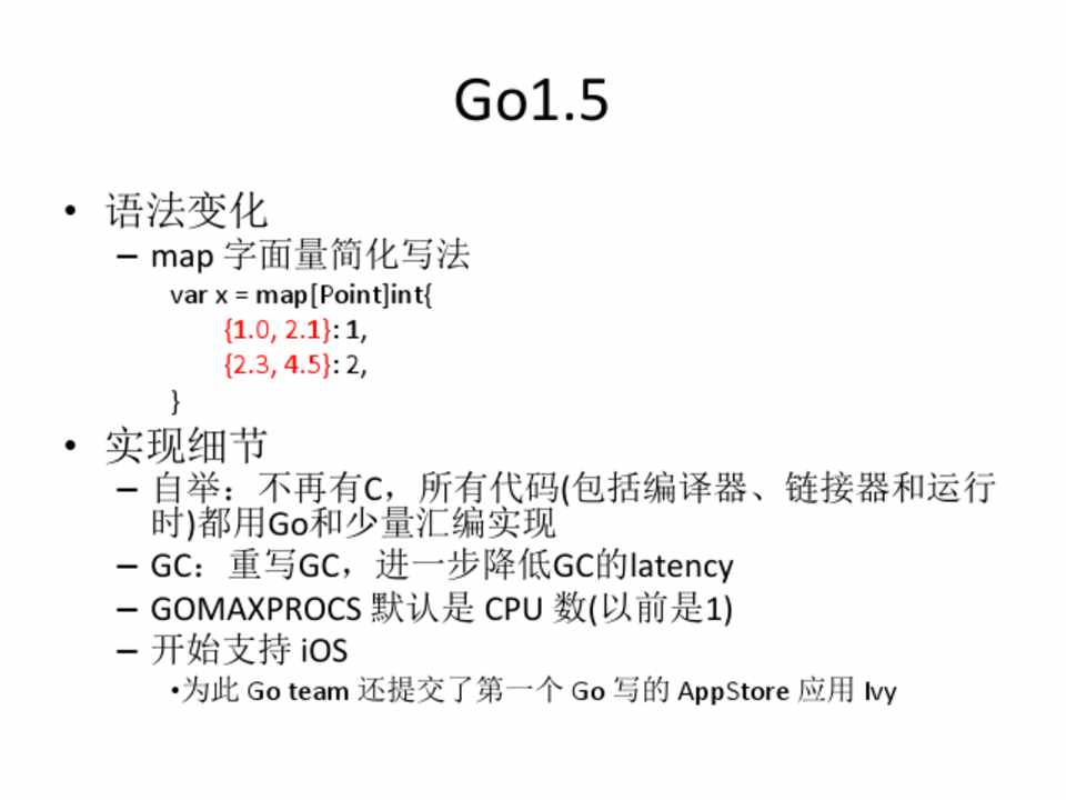 – GC:重写GC,进一步降低GC的latency – GOMAXPROCS 默认是 CPU 数(以前是1) – 开始支持 iOS